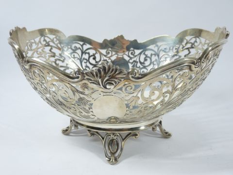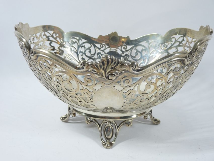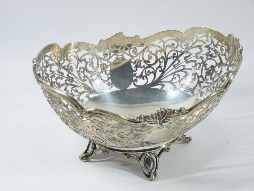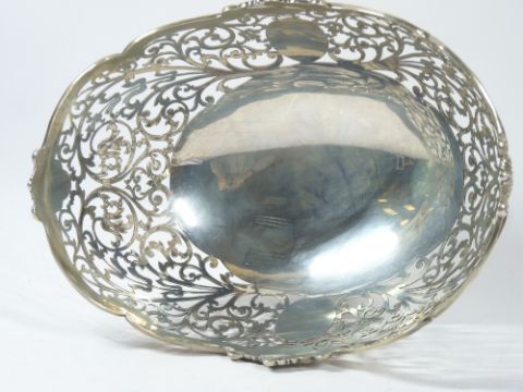 PIERCED SILVER FRUIT BOWL, Sheffield 1951, maker Frank Cobb & Co Ltd, having a wavy border over pierced foliot scroll work, raised on four cameo frame feet, 15cms max H, 25.5cms across, 24.8 troy ozs