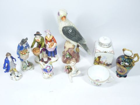 A MEISSEN STYLE PARROT, an Early Meissen style tea caddy, Dresden teacup, various figures with gold anchor marks and an Italian figure of Cherubs ETC