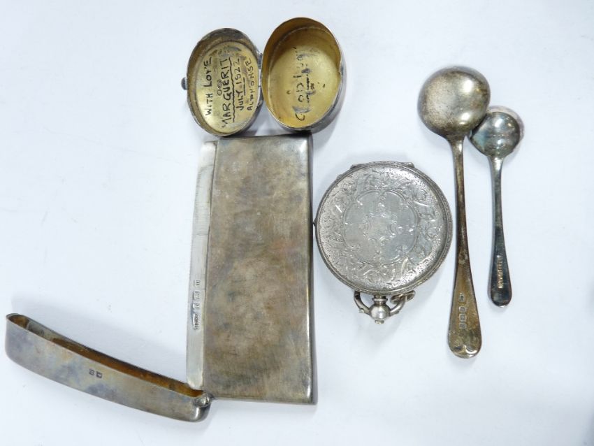SMALL SILVER, 5 ITEMS to include a calling card case, Birmingham 1911, maker Henry Charles Freeman, lady's key wind fob watch, Birmingham 1883, maker Mojon and Montandon, two silver salt spoons, Birmingham hallmarks and a small 925 lidded pill box, the interior with written detail 'With Love Marguerit July 1922 Alphonse', 2.4 troy ozs weighable