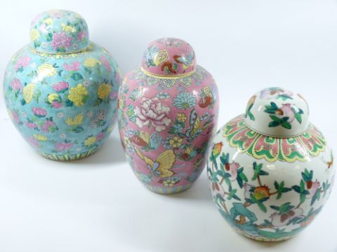 THREE MODERN CHINESE FAMILLE ROSE PORCELAIN JARS & COVERS, variously decorated with lotus, insects, peony, Buddha's hand citron and pomegranate, 35cms, 30cms and 28.5cms