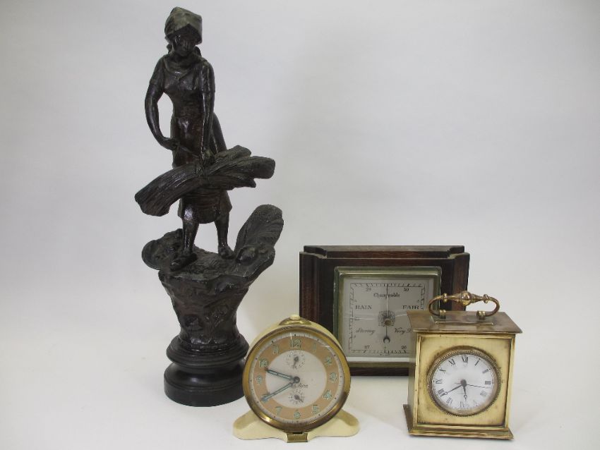 SPELTER FIGURE OF A LADY AT HARVEST TIME, 45cms tall, Smith vintage alarm clock, barometer and carriage clock