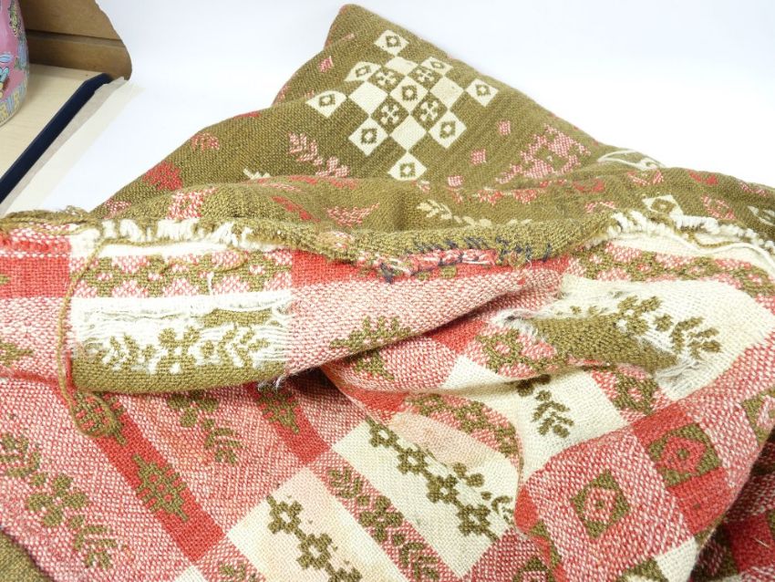 WELSH BLANKET - green ground with red, pink and white patterning, approx 210 x 70cms