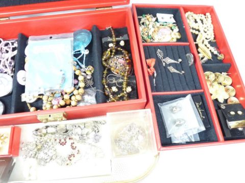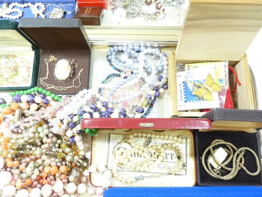 VINTAGE & LATER COSTUME JEWELLERY - a mixed collection on two trays to include a charm bracelet, 9ct rolled gold cameo brooch, twin head snake bangle and other interesting items