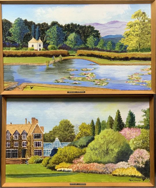 FRANK WORRALL FRCA a pair of naive oils on board - 1. The Lily Pond at Bodnant, and 2. The Residence of The Aberconwy Family with blossom and trees, each signed, 39 x 59cms