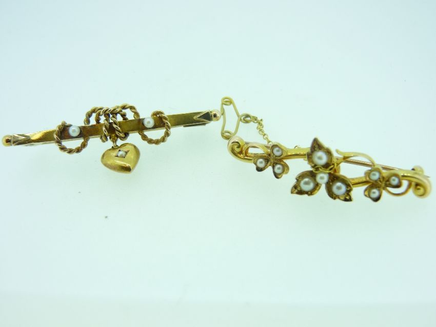15CT GOLD SEED PEARL SET BAR BROOCHES (2) including a twisted rope decorated example with hanging heart and one other with crossover floral design, 6.4grms gross