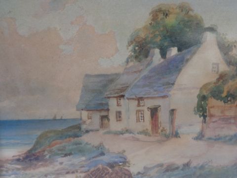 G HOLMES watercolours, a pair - Coastal scenes with thatched cottages and boat to background, 21 x 27.5cms