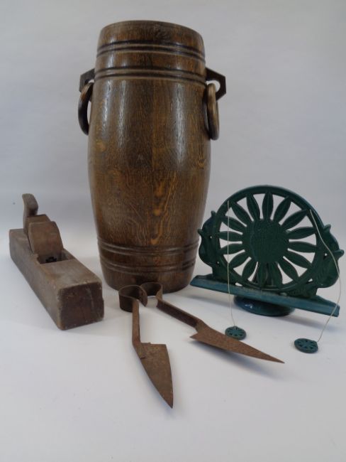 OAK EFFECT BARREL STICKSTAND, cast iron book rest, vintage block plain and a pair of sheep shearers