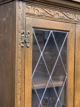 OLD CHARM OAK BUREAU BOOKCASE - leaded glass upper doors and carved linenfold detail to the floor, 208cms H, 80cms max W, 48cms D