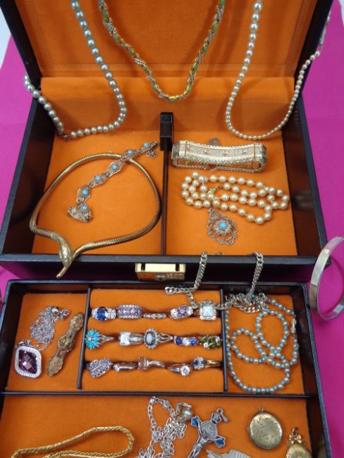 VICTORIAN & LATER JEWELLERY & DRESS RINGS IN A VINTAGE JEWELLERY CASE - a good selection to include silver filigree bracelet and pendant, Victorian pinchbeck bar brooch, gilt metal bracelet with 9ct gold padlock clasp, rolled gold half chase decorated lady's bangle, two rolled gold lockets, a good quantity of silver, cz and colour stone dress rings, seed pearl and turquoise necklace and other interesting items