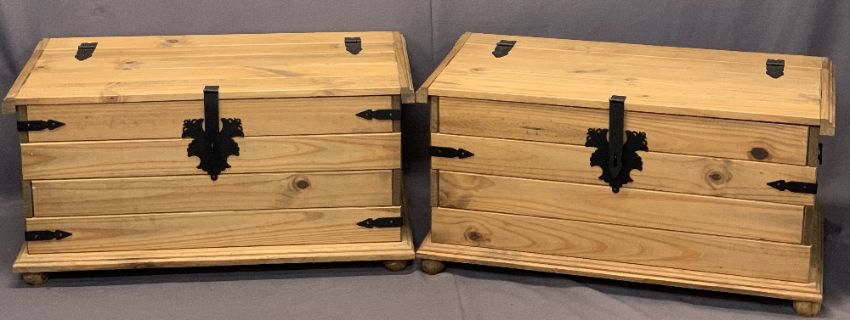 MODERN PINE IRON BANDED BLANKET CHESTS, A PAIR - 46cms H, 92cms max W, 51cms max D