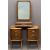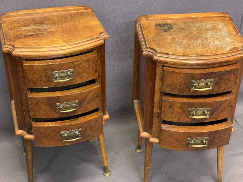 ANTIQUE STYLE WALNUT DRESSING MIRROR and two bedside chests, the mirror with swing action, brass mounted supports and three lower drawers on corner bracket feet, 64.5cms H, 40cms W, 20cms D, the bedsides formally part of a larger chest with shaped tops and three brass handled bow front drawers on later spindle type legs, 55cms H, 30.5cms W, 26cms D
