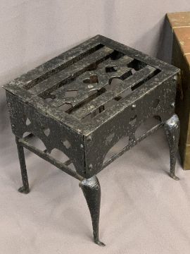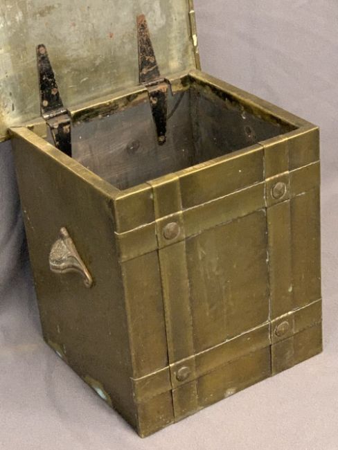 CAST IRON FOOTMAN & A BRASS TWO-HANDLED SQUARE TOPPED COAL BOX with banded detail, 38cms H, 35cms W, 53cms D