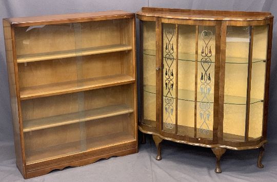 VINTAGE WALNUT CHINA DISPLAY CABINET and a glass fronted teak bookcase, 114cms H, 102cms W, 31cms D and 112cms H, 91.5cms W, 25cms D measurements respectively