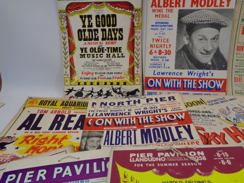 VINTAGE THEATRE/SHOWTIME COLLECTION OF SHOW CARDS, POSTERS & ASSOCIATED EPHEMERA - excellent colourful collection including Pier Pavilion Llandudno, Pavilion Liverpool, North Pier Blackpool, Theatre Royal Nottingham, Royal Aquarium Great Yarmouth, Victoria Theatre Salford, Palace Theatre Huddersfield, New Theatre Northampton and other venues, Old Time Stars include Al Reed, Vic Oliver, Albert Modley, Charlie Chester, Phyllis Dixie and others, additionally Winter Gardens Morecambe, Boxing Display card Ron Price The Paddy Bonner and Dave Paterson v Johnny Wilde, Paul Madoc wrestling posters for Kung Fu v The Mighty Chang, The Wild Man of Borneo 'The Gorgeous George', King Kendo Nagasaki 'Oric Williams' (past well known footballer), Miss Rusty Blair 'The Gorgeous Gloria Graeme', almost 100 items including multiples