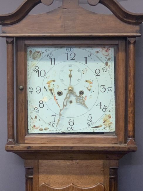 CIRCA 1840 OAK LONGCASE CLOCK - 13inch painted square dial set with Arabic numerals and subsidiary seconds dial before a twin weight pendulum driven bell strike movement (pendulum and weights included), the hood with broken swan neck pediment and carved fan crest over a single glazed door and turned flanking pillars, shaped top long trunk door with quarter cut reeded pillar decoration and concave mouldings to the trunk base, 212cms overall H, 49cms W