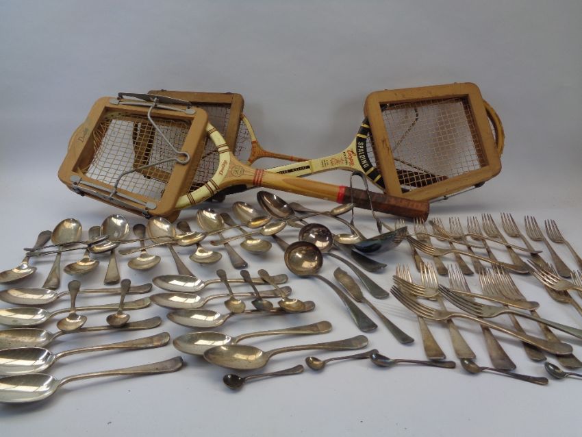 VINTAGE TENNIS/BADMINTON RACQUETS and a quantity of EPNS cutlery, loose