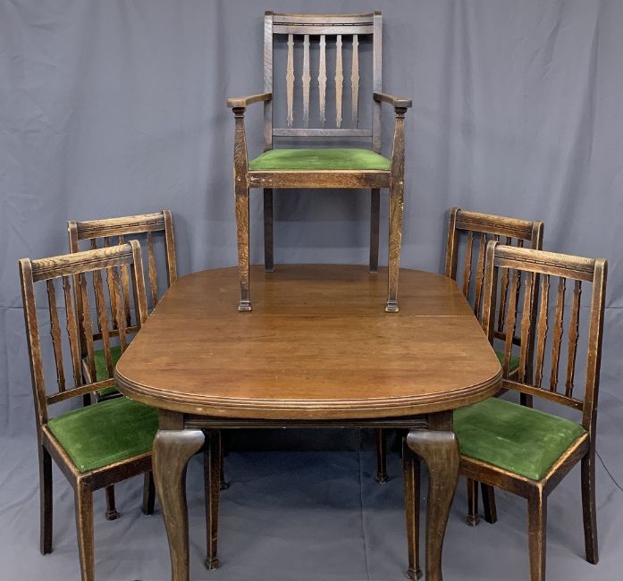 MAHOGANY WIND-OUT TABLE (no leaf) - on castors, 77cms H, 131cms W, 106cms D and polished spindle back chairs (4 + 1)
