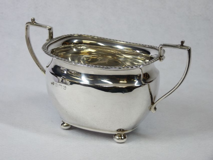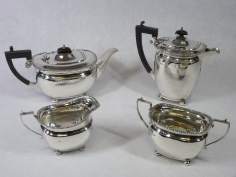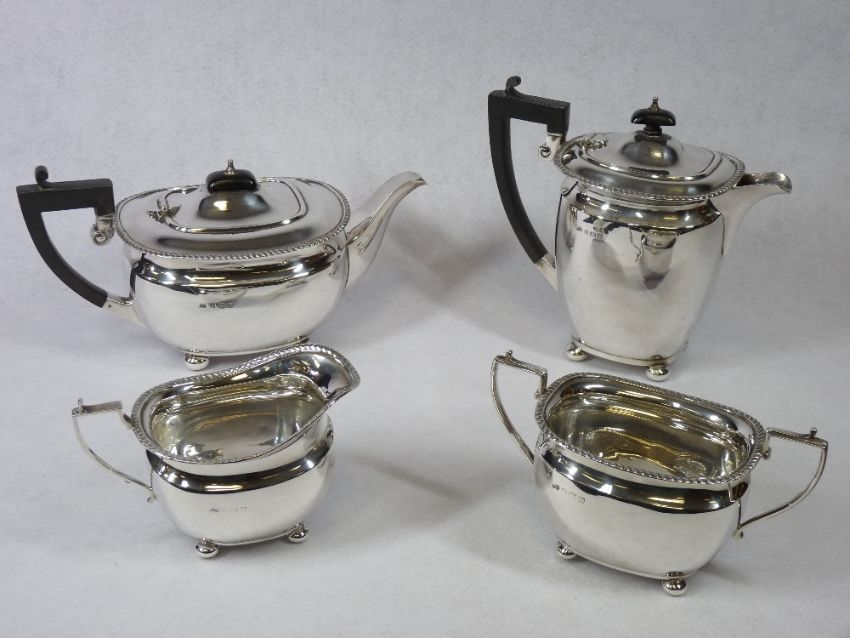A FOUR PIECE SILVER TEA & COFFEE SERVICE - each piece of oval plain form with four ball supports and with gadrooned top edging (handles and knops to teapot and coffee pot non-silver), Birmingham 1937/8/9, 49ozs gross