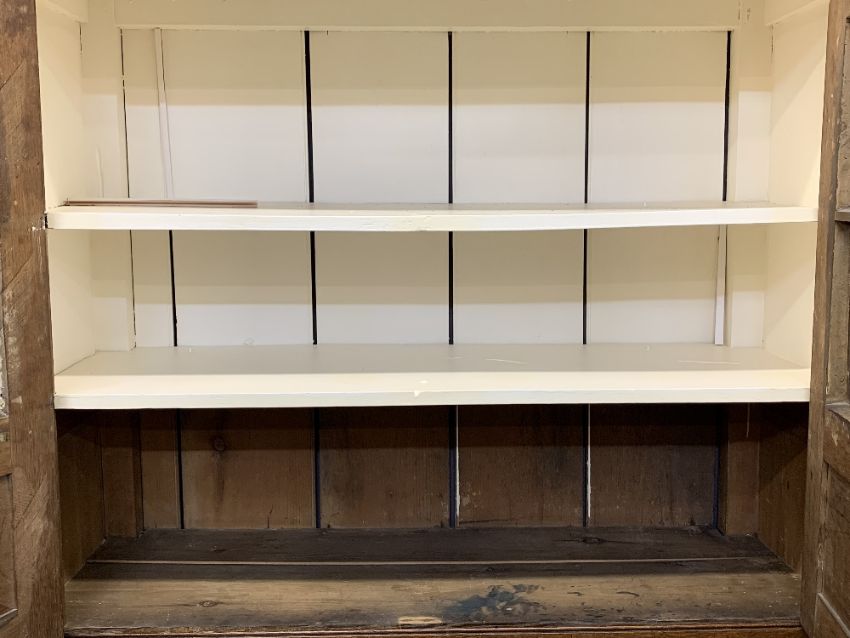 ANTIQUE OAK FARMHOUSE CUPBOARD - of good colour, peg joined construction with twin upper glazed doors over two frieze drawers and base cupboard doors all having brass knobs and diamond shape bone escutcheons, 167cms H, 118cms W, 39cms D