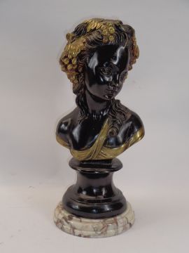 REPRODUCTION BRONZE & GILT HIGHLIGHTED BUST - a young maiden with fruit and vines in her hair on a socle base and circular pink marble base, 47cms H