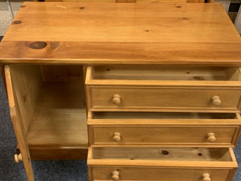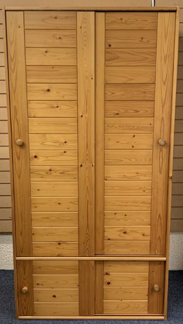 MODERN PINE BEDROOM FURNITURE, 3 ITEMS - a sliding door double wardrobe with additional sliding doors to the base, 197cms H, 100cms W, 66cms D, low chest of three drawers with side cupboard door on a plinth base, 64.5cms H, 109cms W, 57cms D along with a pine hanging rack, 169cms H, 74cms W, 50cms D