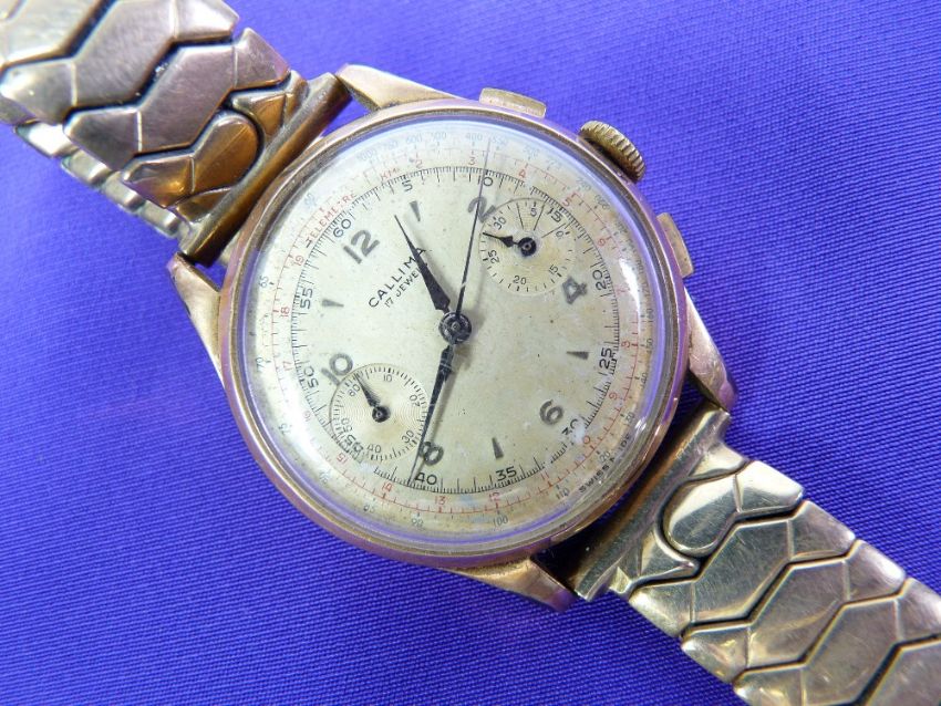 A GENT'S 18CT GOLD ENCASED CALLIMA CHRONO WRISTWATCH - 64grms gross on a 9ct back and front Excalibur expanding bracelet (part missing)