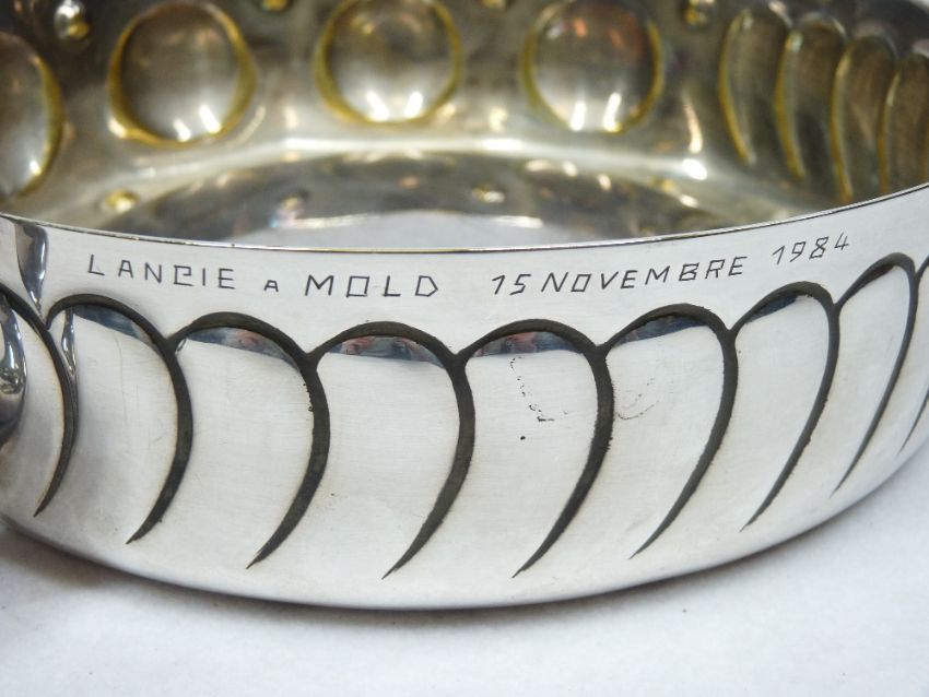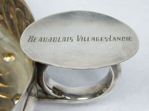 EPNS - an oversized French wine tasting cup advertising Beaujolais Villages Lancie and inscribed to the side 'Lancie a Mold 15 Novembre 1984', other electroplate items including hip flask, fruit spoon and a pair of framed prints