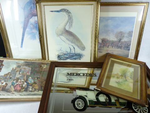 F RIDGWAY watercolour study - depicting a river with bridge with a young woman in a boat to the foreground, signed and dated 1914, 26 x 16.5cms with a selection of decorator's prints and a vintage style mirror picture depicting a Mercedes Edwardian Tourer 1908, 62 x 87cms overall