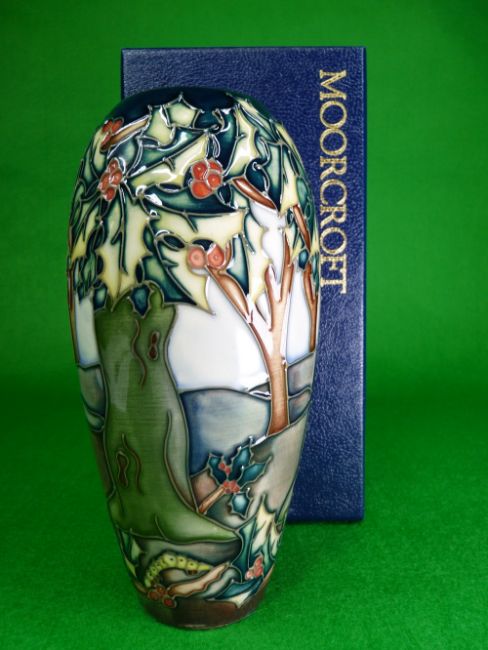 MOORCROFT 'Holly Hatch' vase by Rachel Bishop - 18.5cms H, impressed and painted factory marks to the base, dated '97, in original box