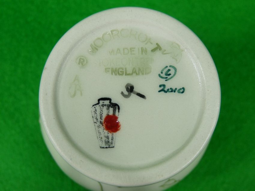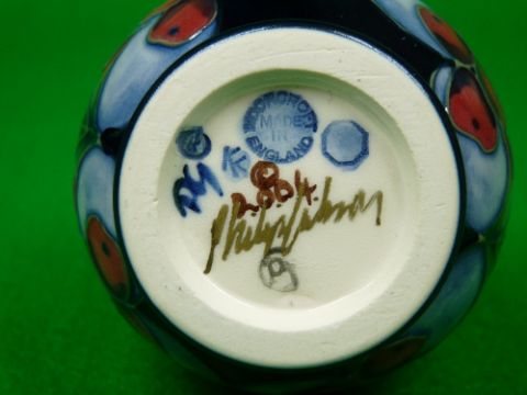 MOORCROFT 'Red Rose, Holly and Berry and Lapland vases' - the first being Cobalt ground by Emma Bossons, shape No 55/2, May 2016, 5cms H, in original box with outer sleeve, the second on cream ground by Phillip Gibson, Christmas gift 2004, signed to the base, 10cms H in plain box, the final vase on cream ground with Cobalt lip and interior, designed by Kerry Goodwin, marked as seconds quality, 2010, 8.5cms H, no box, all have impressed and painted factory marks