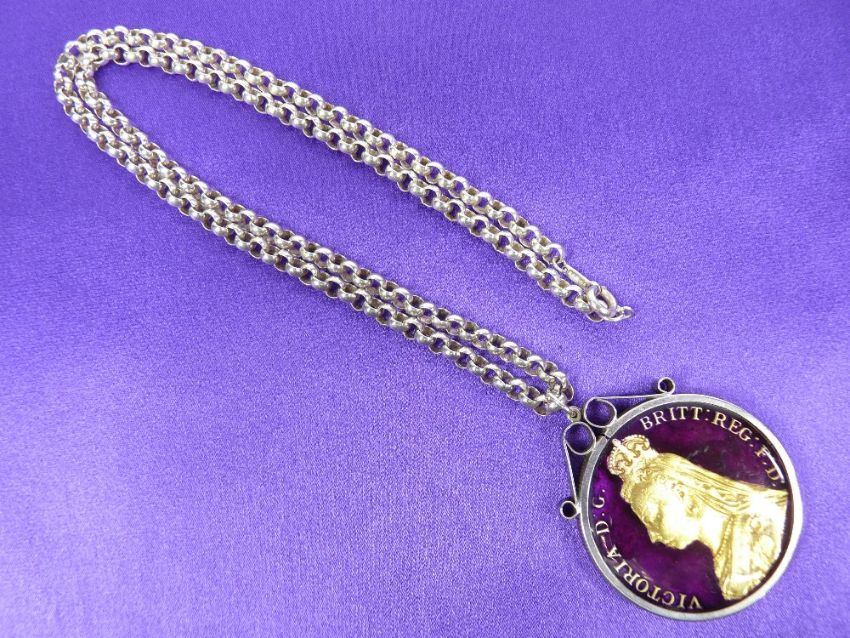A VICTORIAN ENAMELLED CROWN - in a silver mount, 1891 with muff type chain (20grms), 56grms total