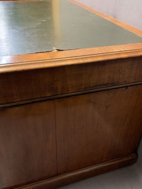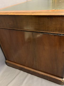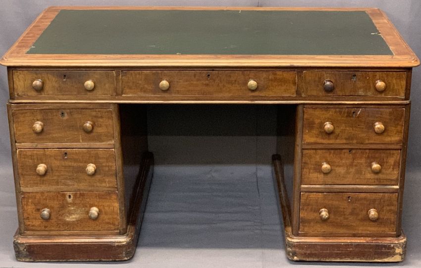 VICTORIAN MAHOGANY TWIN PEDESTAL DESK - having a green leather insert and moulded edge over twin banks of four drawers and single central drawer, all with turned wooden knobs on plinth bases, 75cms H, 138cms W, 81cms D