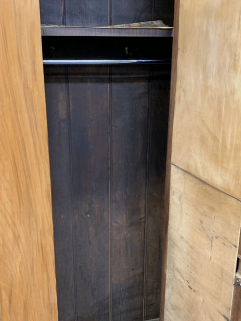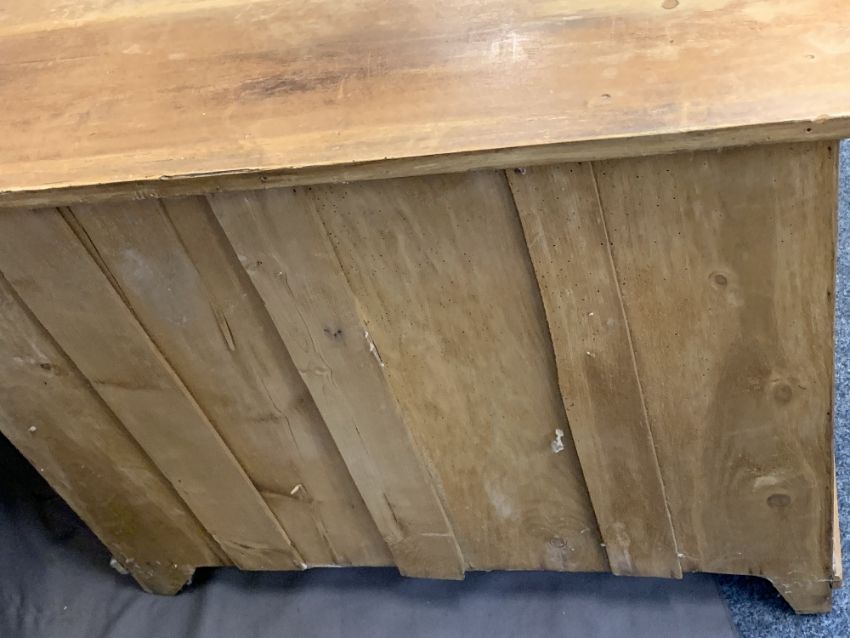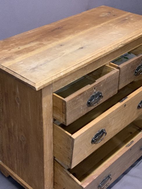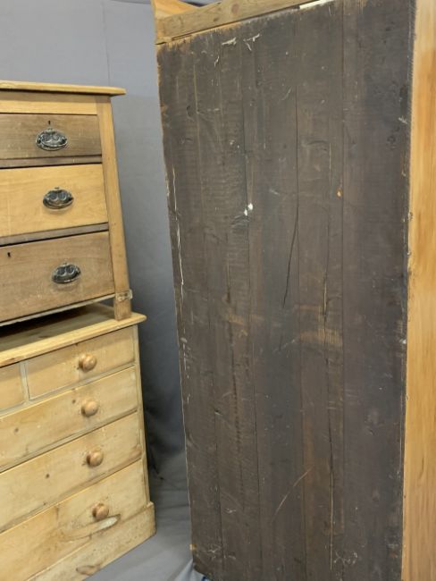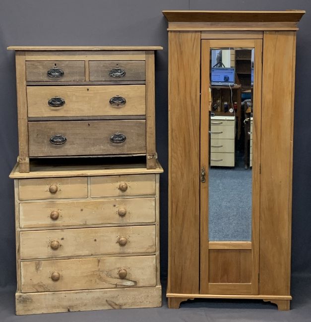 STRIPPED VINTAGE PINE BEDROOM FURNITURE, 3 ITEMS - a single door mirrored wardrobe, 187cms H, 84cms max W, 42cms D, Victorian chest of two short over three long drawers with turned wooden knobs on a plinth base, 90cms H, 94cms W, 41cms D and a further chest of two short over two long drawers, 77cms H, 93cms W, 41.5cms D