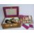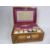 AN OBLONG MULTI-WOOD INLAID & LIDDED SEWING BOX - with interior partitioned tray together with the contents comprising cotton reels, wool and other related items