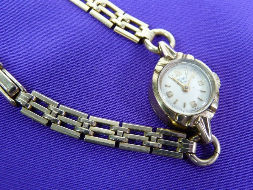 A LADY'S ROTARY 9CT GOLD CIRCULAR DIAL WRISTWATCH - with rolled gold three row bracelet, 12grms gross