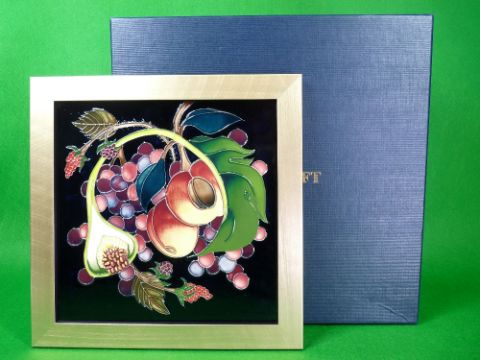 MOORCROFT 'Queen's Choice' trial piece plaque by Emma Bossons - in original frame, 25.25 x 25.25cms, impressed and painted factory marks verso including trial 7-11-14, original price label attached, original box and outer sleeve