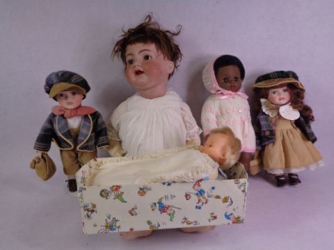 VICTORIAN PORCELAIN HEADED DOLL, 60cms L, a quantity of other dolls