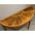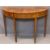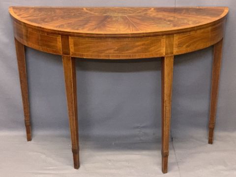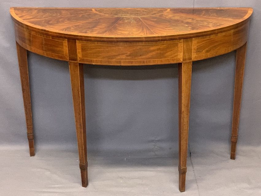 CROSSBANDED MAHOGANY & BURR WALNUT SHERATON STYLE HALF MOON HALL TABLE - the segmented veneer top with boxwood inlays repeated to the frieze on square tapering supports, 83cms H, 122cms W, 45cms D