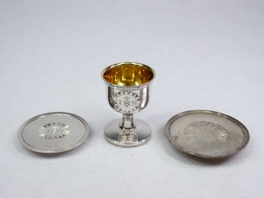 A CASED MINIATURE CHALICE CUP & PLATE SET - marks in fine condition, 2.2ozs, Birmingham 1836 and a cased miniature chalice plate, 0.9ozs, London 1842
