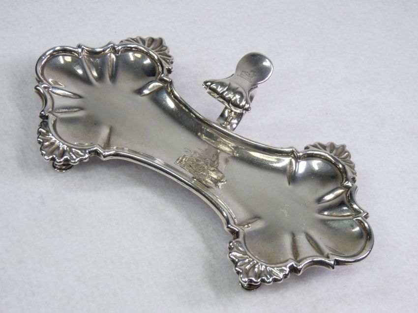 A GEORGIAN SILVER QUILL TRAY - of shape form on four hoof supports, 9.2ozs, London 1749, 20cms L, Maker's initial unclear together with a French silver mounted ivory letter opener