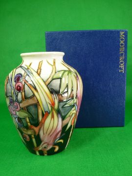 MOORCROFT 'Fruit Thief' vase by Emma Bossons - Limited Edition for Liberty, silver line strike seconds quality, 20.5cms H, impressed and painted factory marks to the base including designer's signature, 33/100, stamped 'Made for Liberty', dated 2002, in original box with outer sleeve