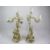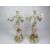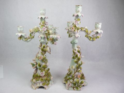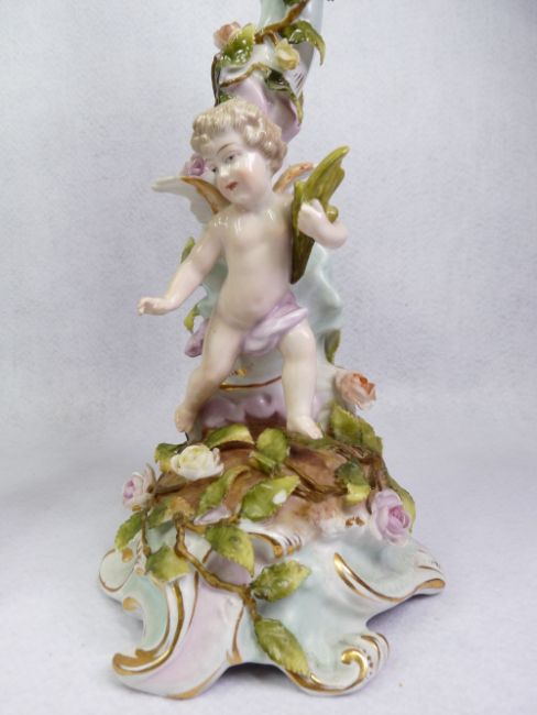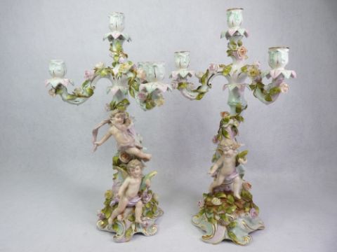 PLAUE PORCELAIN CHERUB & FLORAL ENCRUSTED CANDELABRA, A PAIR - underglazed crossed hatch in blue to the bases, one branch/candle sconce missing, 39cms H