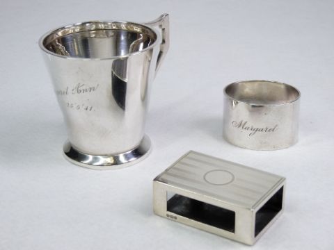 SMALL SILVER PARCEL - a plain tapered tankard inscribed 'Margaret Ann 25 05 41, 3.9ozs, Birmingham 1939 (impact dent in the body under the inscription), a silver match holder with engine turned top, 1.1ozs Birmingham 1919 and a heavy oval silver napkin ring, 2.2ozs, Chester 1940