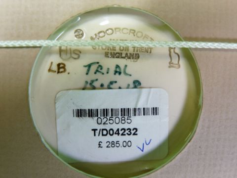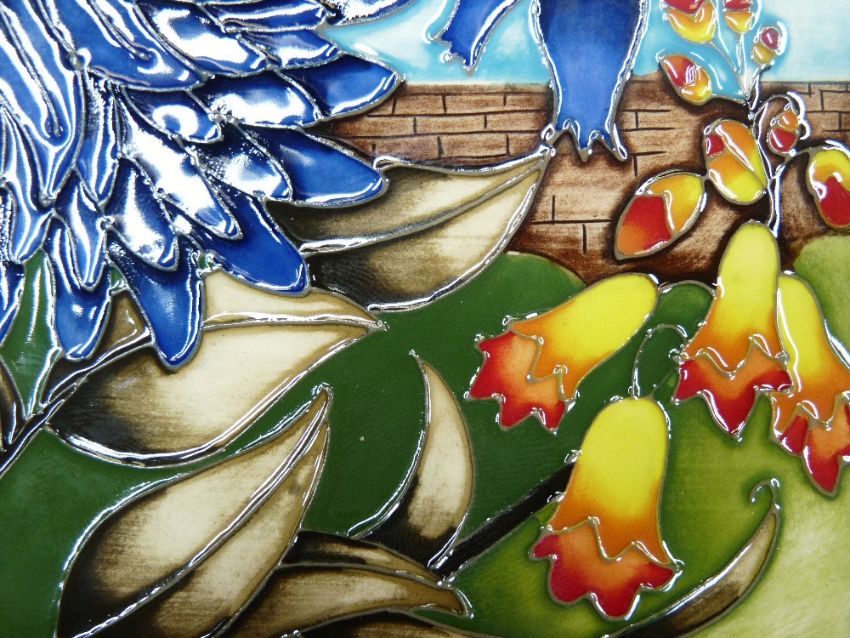 MOORCROFT unknown design trial piece tile possibly by Vicky Lovatt - depicting a walled garden with fruit and flowers in original frame, unsigned, impressed and painted factory marks verso including trial 15-5-18, original price label attached, 14 x 25cms overall, boxed, probably non-production item