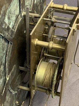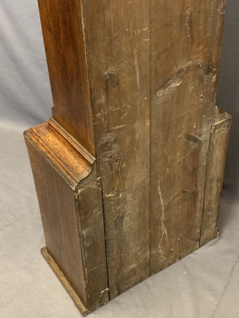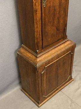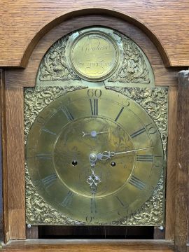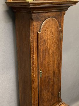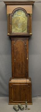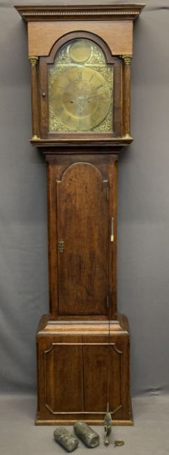 CIRCA 1840 OAK LONGCASE CLOCK with arched top Bastal brass dialwith Gowland Sunderland name plaque, the brass chapter set with Roman numerals before a twin weight pendulum driven bell strike movement, pendulum and weights included (restoration required to the dial), restored case hood with single arched top glazed door and flanking reeded pillars with Corinthian brass caps over a long shaped top trunk ring door and stepped base, 205cms overall H, 52cms W