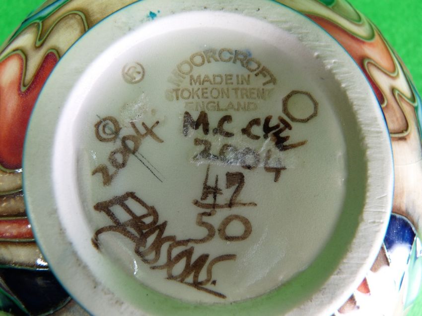 MOORCROFT limited edition pot and cover 47/50 by Emma Bossons - unknown design with seconds quality silver line strike, 10.5cms overall H, 13cms diameter, impressed and painted factory marks to the base including designer's signature, M C C mark for Moorcroft Collector's Club dated 2004, no box