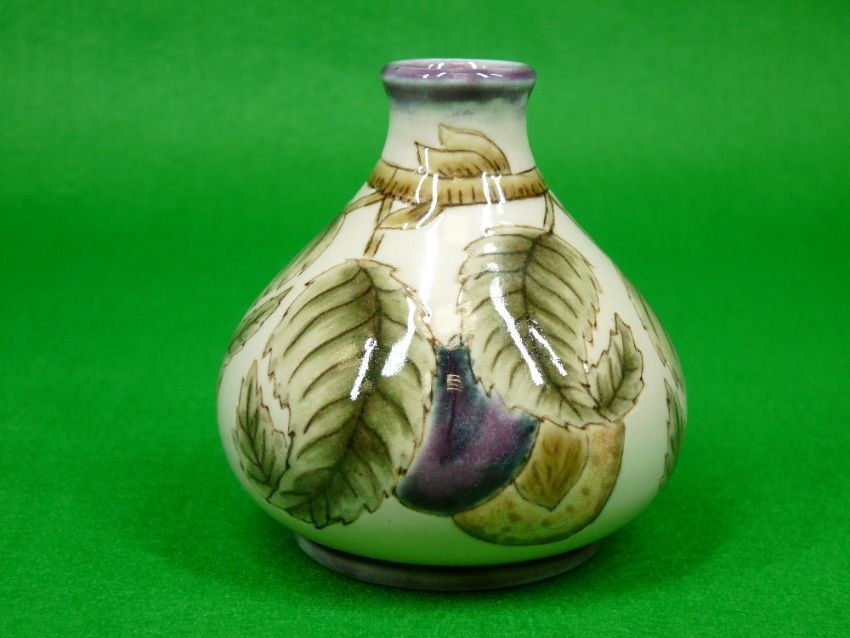 COBRIDGE & BLACK RYDEN VASES (2) - to include a 9cms H squat vase (plum) on a mushroom ground designed by Nicola Slaney, impressed factory marks to the base, in original box, the Black Ryden vase squat form (echoes) designed by Emma Bossons, 9cms H, 14cms diameter on a tonal cream and yellow ground, impressed and painted factory marks to the base, in original box, dated '98 and '02 respectively