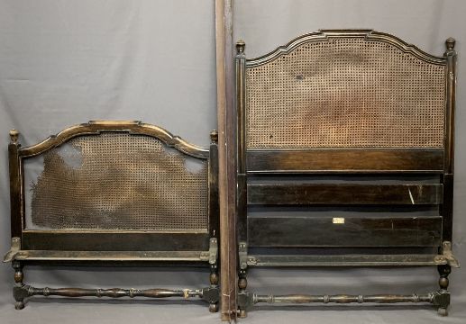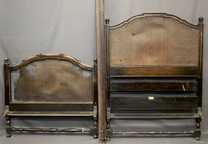 HEAL & SON SINGLE BED HEAD & FOOT BOARD - with cane back (for restoration), irons included, 144cms H, 107cms L