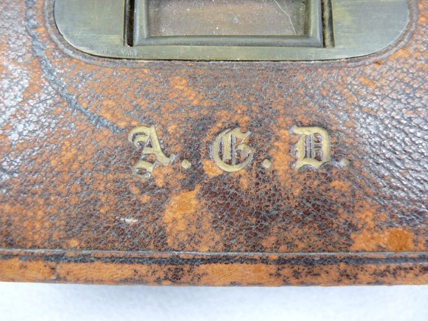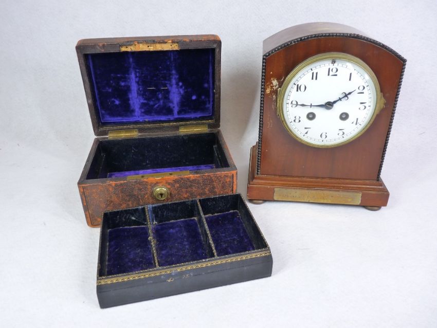 A MAHOGANY ENCASED CIRCULAR DIAL MANTEL CLOCK - with eight day French movement (for restoration) and a leather bound lidded compact jewellery box with interior sectioned tray