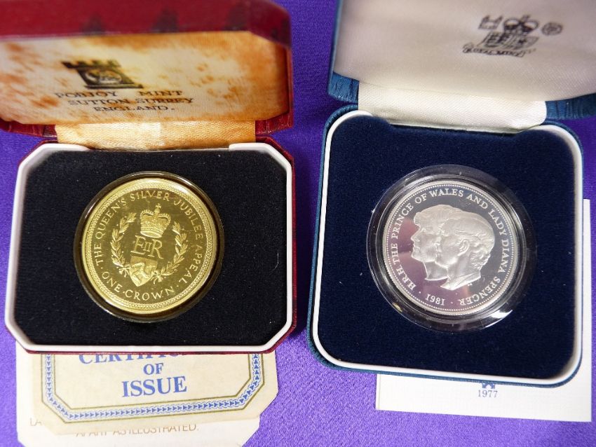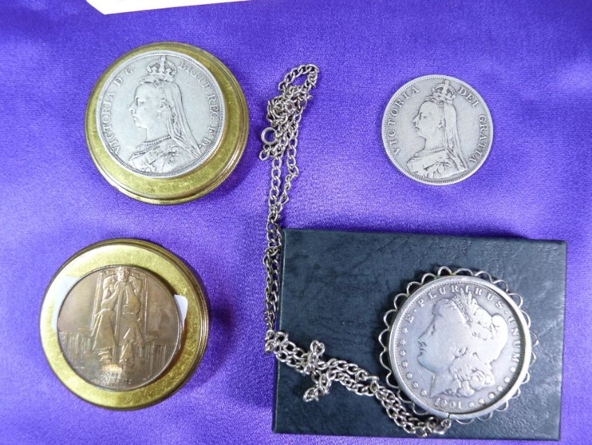 MIXED COINAGE, A PARCEL including an 1889 Victoria Crown, a silver florin, a 1924 British Empire medal, an American dollar with silver chain and four boxed Royal Mint Commemorative crowns